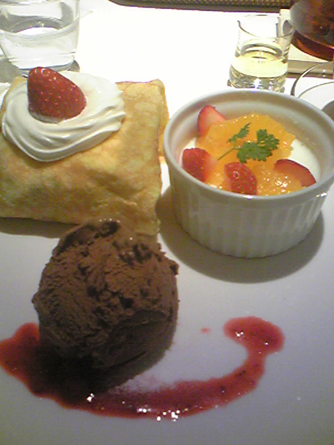 クレープ(?)と、フルーツの乗った杏仁豆腐、チョコレートアイスです。